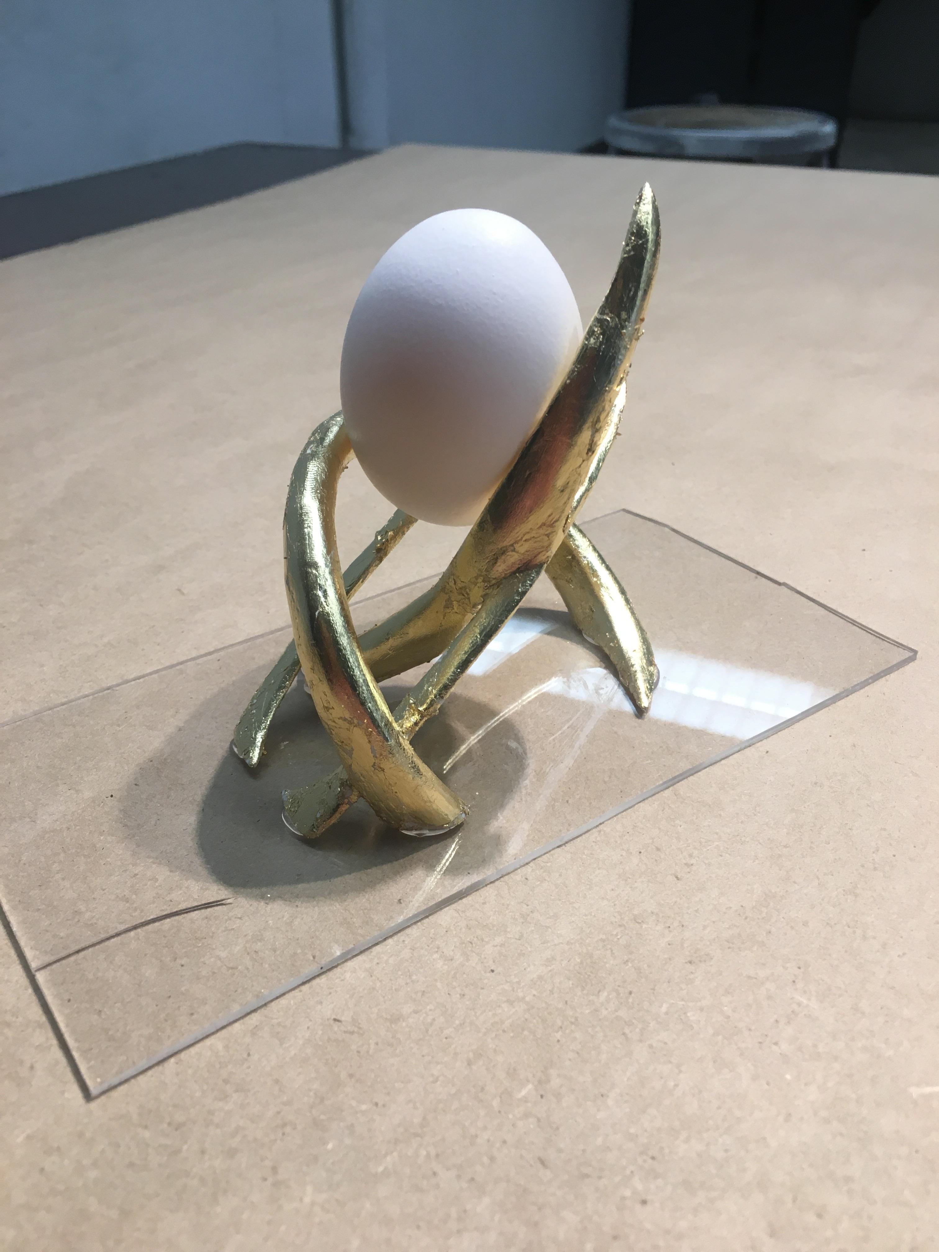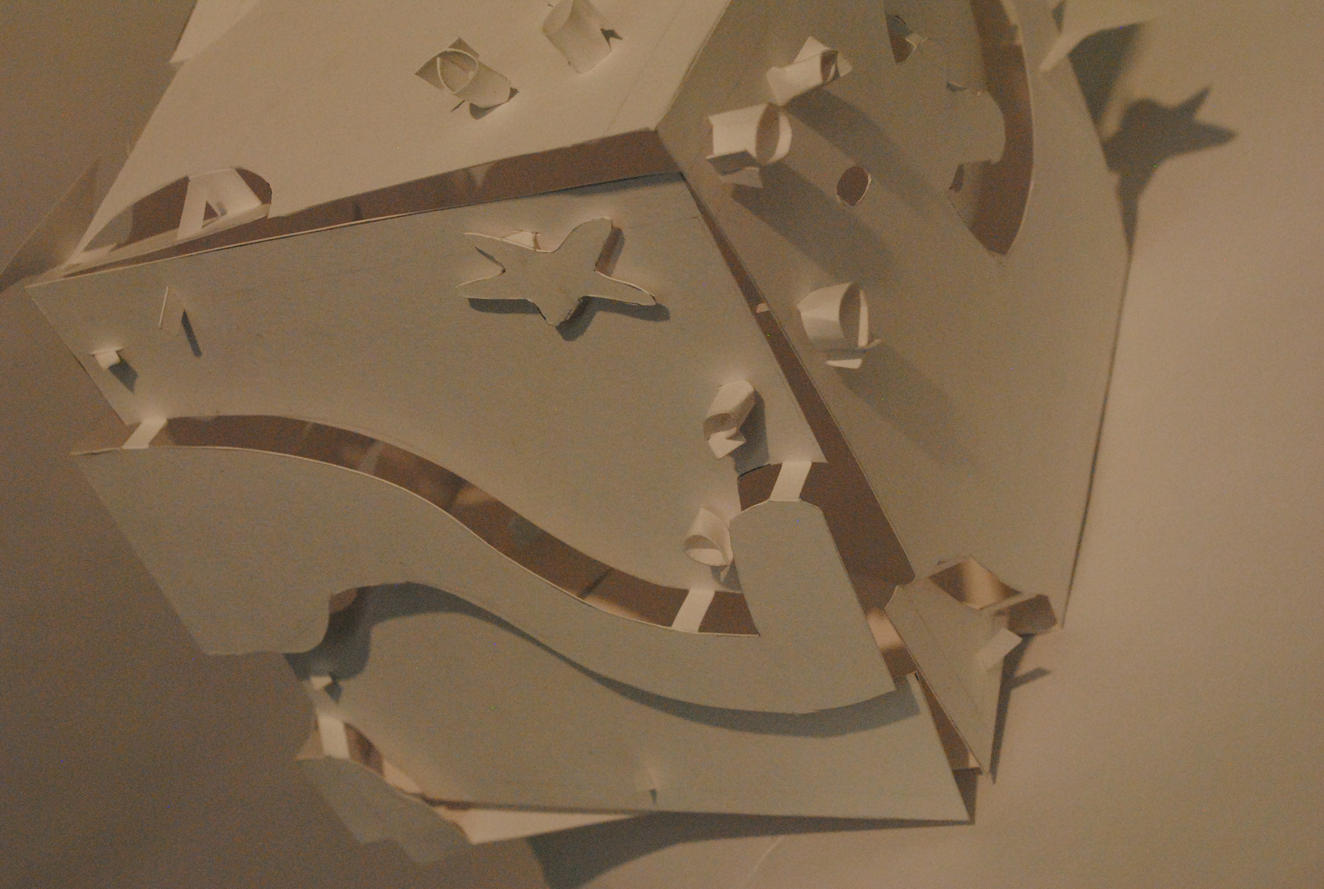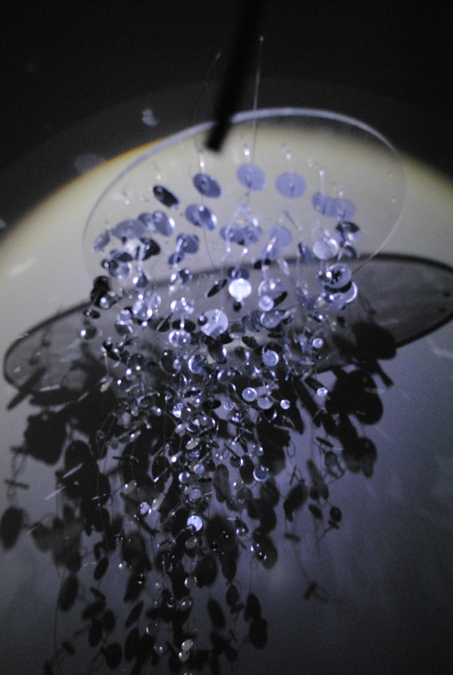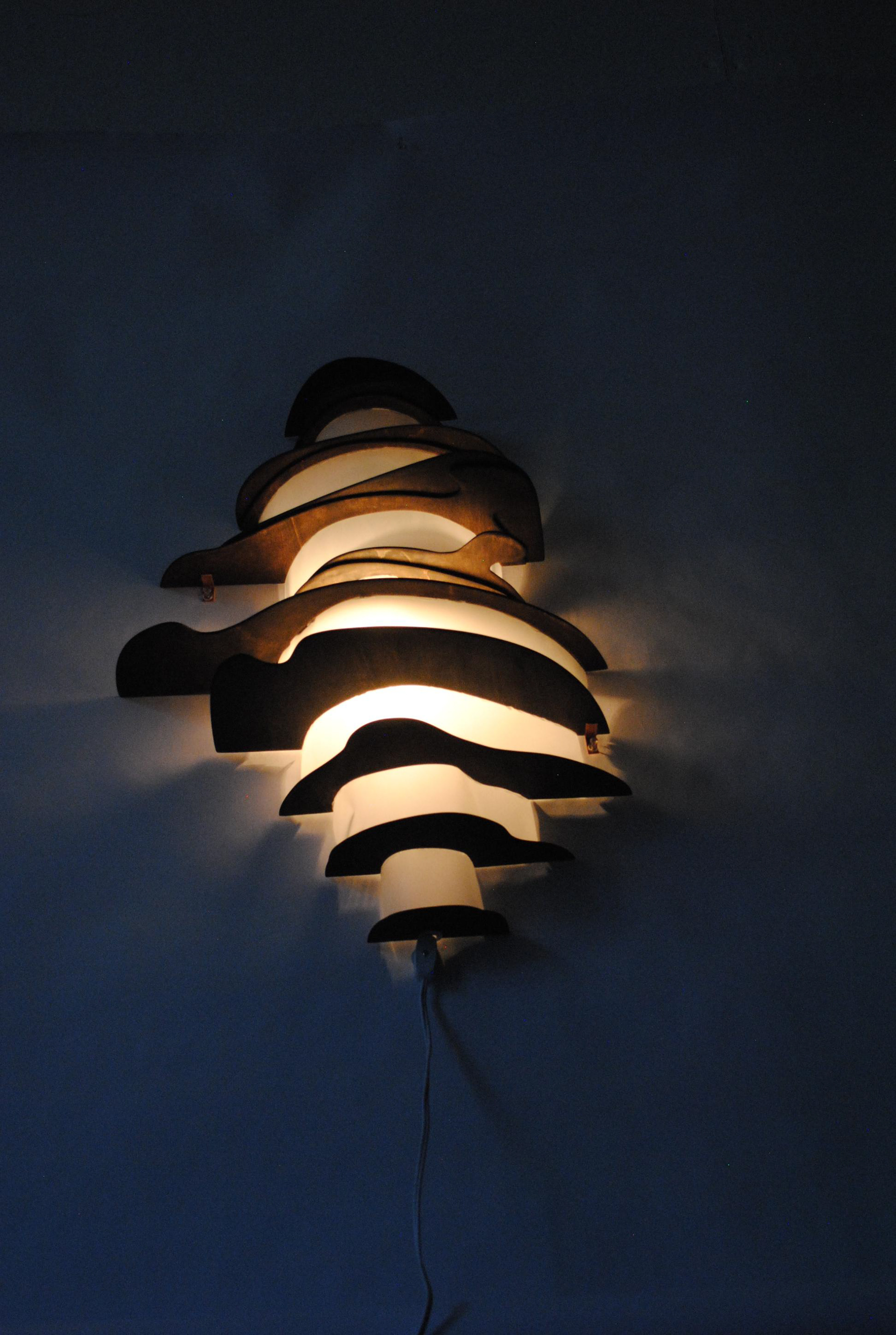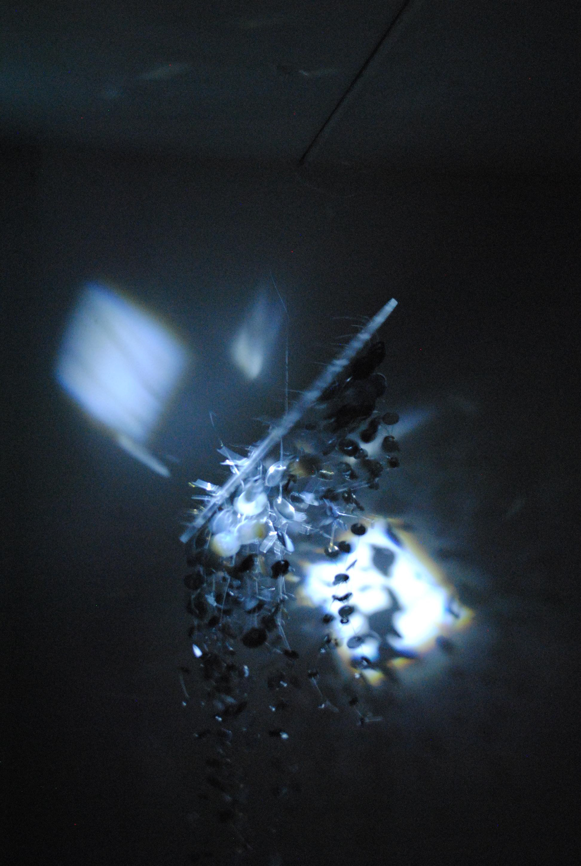 Wood, mylar, 3D print, copper, lightbulb & wires